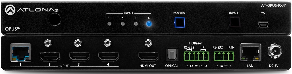 The Atlona AT-OPUS-RX41 is a 4×1 switcher and receiver for 4K high dynamic range (HDR) formats. It features three HDMI inputs, plus an HDBaseT input for receiving video, embedded audio, control signals, power, and Ethernet over distances of up to 330 feet (100 meters).Read More