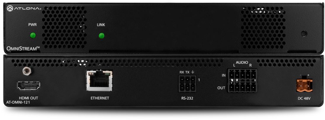 The Atlona OmniStream™ 121 (AT-OMNI-121) is a single-channel networked AV decoder for HDMI 2.0 / HDCP 2.2 output supporting resolutions up to 4K @ 60 Hz and HDR (High Dynamic Range), plus audio embedding and de-embedding, and RS-232 or IR control pass-through. It is part of the OmniStream Pro Series, designed for high performance, flexible distribution of AV over standard, off-the-shelf Gigabit Ethernet switches in commercial audiovisual applications. It features advanced high-quality, VC-2 visually lossless video decoding technology with user-selectable, video quality optimization engines designed for computer-generated imaging, or motion video content. The Atlona OmniStream 121 achieves extremely low, sub-frame latency when paired with OmniStream AV encoders. This single-channel decoder is housed in a half-width rack enclosure with front-to-back air flow, and is ideal for high-density, compact installation in distributed, multi-display installations.