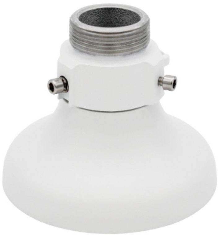 In some models the mount connector is built-in, but with most models, this cast metal adapter ring must be used to attach the camera to threaded mount poles. The adapter screws onto the threaded pole and incorporates a recessed ring that retains the PTZ head's set screws and service retainer chain if so equipped.