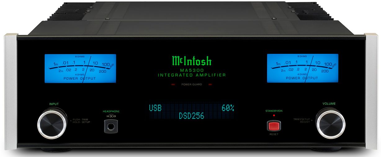 Rounding out the MA5300 are time tested McIntosh technologies including Power Guard®, Sentry Monitor™, Home Theater PassThru, High Drive headphone amplifier with Headphone Crossfeed Director (HXD®), and gold-plated speaker binding posts. The classic McIntosh aesthetic of blue Watt meters, a black glass front panel with aluminum end caps, control knobs and illuminated logo complete the MA5300. Contact your local dealer? to learn more. ?
