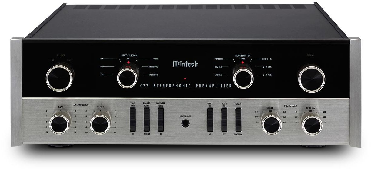 The C22 Mk V sits atop a stunning polished stainless steel chassis and features the timeless McIntosh illuminated logo, control knobs, and aluminum end caps. With its retro black glass and aluminum front panel design, the C22 Mk V will fit right in with McIntosh home audio systems of any era – from the 1950s to current day. Contact your local dealer to learn more.